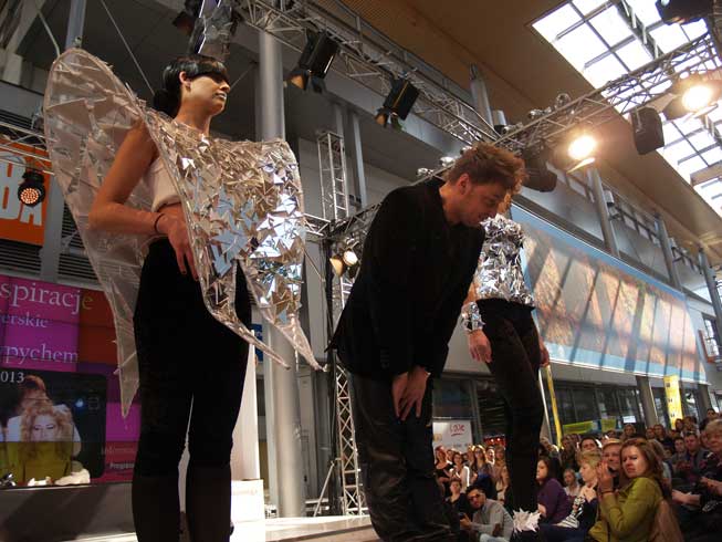 Doskonałym dowodem tego był ostatni pokaz Bianco&Nero dla firmy Progress Września i marki Artistique. Fryzury jakie zaproponował nam mistrz miały geometryczne kształty oraz kanciaste wykończenie, a to za sprawą znakomitych kosmetyków do stylizacji marki Artistique oraz bogatej kolorystyce farb, które wyróżnione zostały złotym medalem tegorocznych targów. Piękno fryzur podkreślił oryginalny wizaż modelek, którego autorami byli Małgorzata Marosze, Henia…, a całość uzupełniła pięknym tańcem Emilia Sławińska, która zabrała nas w swoje magiczne i niezwykle wrażliwe krainy podświadomości. Białe szarfy powiewające w rytm pięknej muzyki, do której tańczyły modelki – niczym marionetki, którym sznurki pociągał sam Robert Wypych oraz lustro, które królowało w trakcie pokazu podkreśliły oryginalność widowiska. Myślę, że każdy w tym pokazie mógł odnaleźć coś dla siebie, ujrzeć swoje odbicie w lustrze – wszelkie wady, zalety, zahamowania i doświadczyć niesamowitych ekspresji.